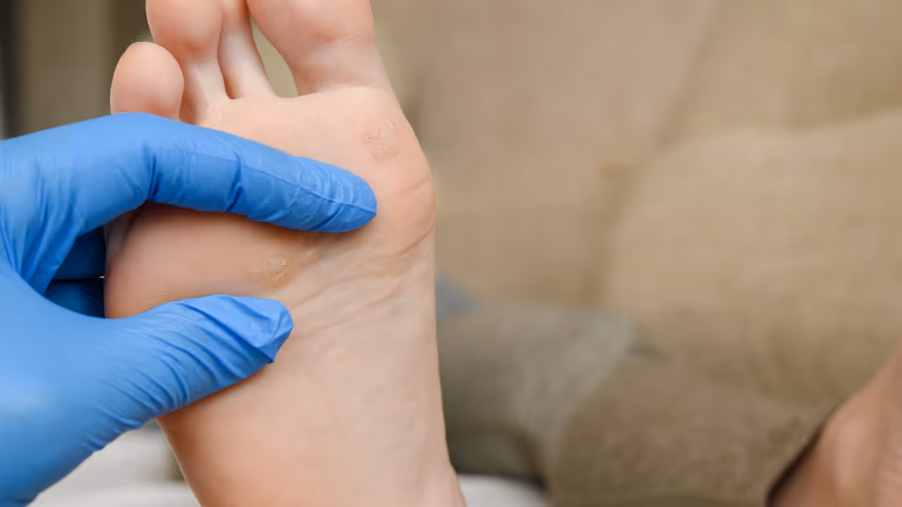Plantar warts, called verrucae plantares, sit on the soles of the feet and behave differently than other warts. Due to the pressure of your body weight, they grow inward instead of outward. They are often covered with a thick layer of calluses, which can make them look like a corn. The distinction is important because the treatment differs. Warts interrupt the skin lines, while a corn follows the skin lines. If you remove the callus carefully, you will see small black dots in a wart, which is not the case with a corn.